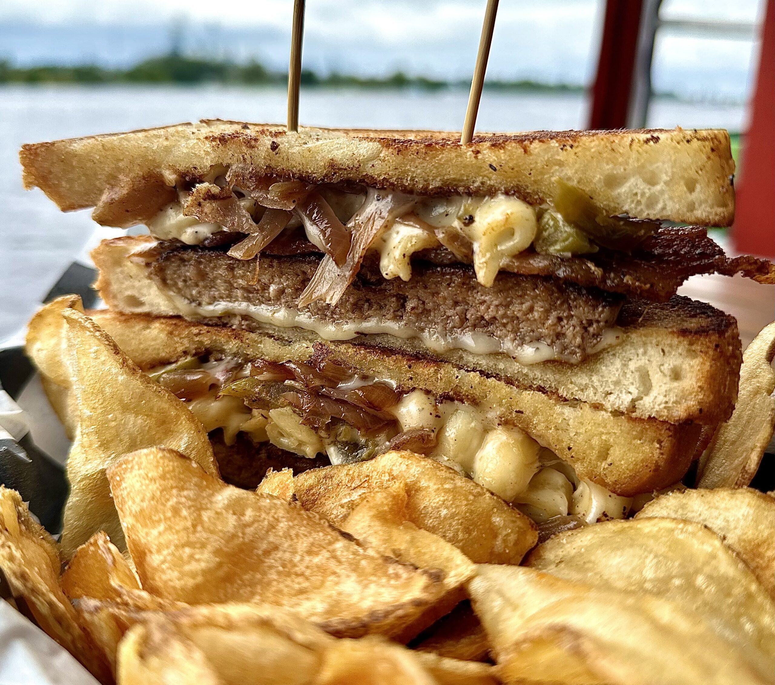 A burger patty, grilled onions, three pieces of bacon, two pieces of pepper jack cheese, four slices of jalapeños and 3 ounces of mac & cheese, served on white bread.