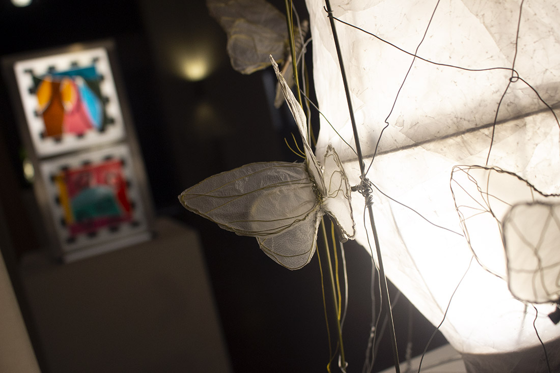 Chris Cook’s “Embark” includes butterflies flocking to the light, made of metal, wire and plastic — on display as part of “Illumination.” (Port City Daily/Shea Carver)