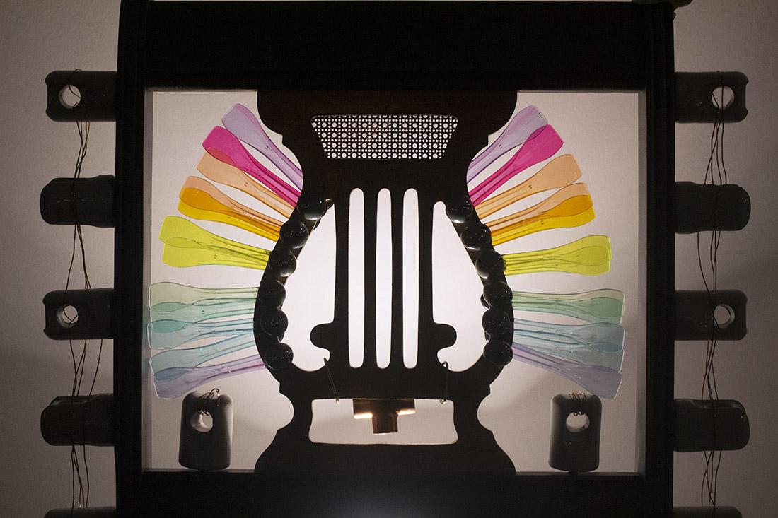 Carolyn Faulkner’s “The Finishing Touch” consists of polycarbonate plastic, wood, acrylic, paint and fabric — on display as part of “Illumination.” (Port City Daily/Shea Carver)