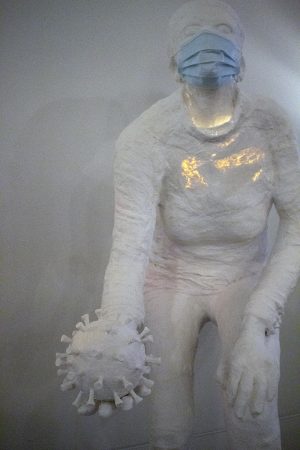 Hampstead artist Deborah Bluestein and Raleigh-based artist Jeanie Redick took a literal approach in “Pandora Revisited.” They created a life-size plaster sculpture from model Tabatha Radaker, who is masked and placing the novel coronavirus into a trunk, i.e. Pandora’s box. All white, the sculpture shows a hint of blue from the surgical mask and golden rays emitting from the model’s chest.