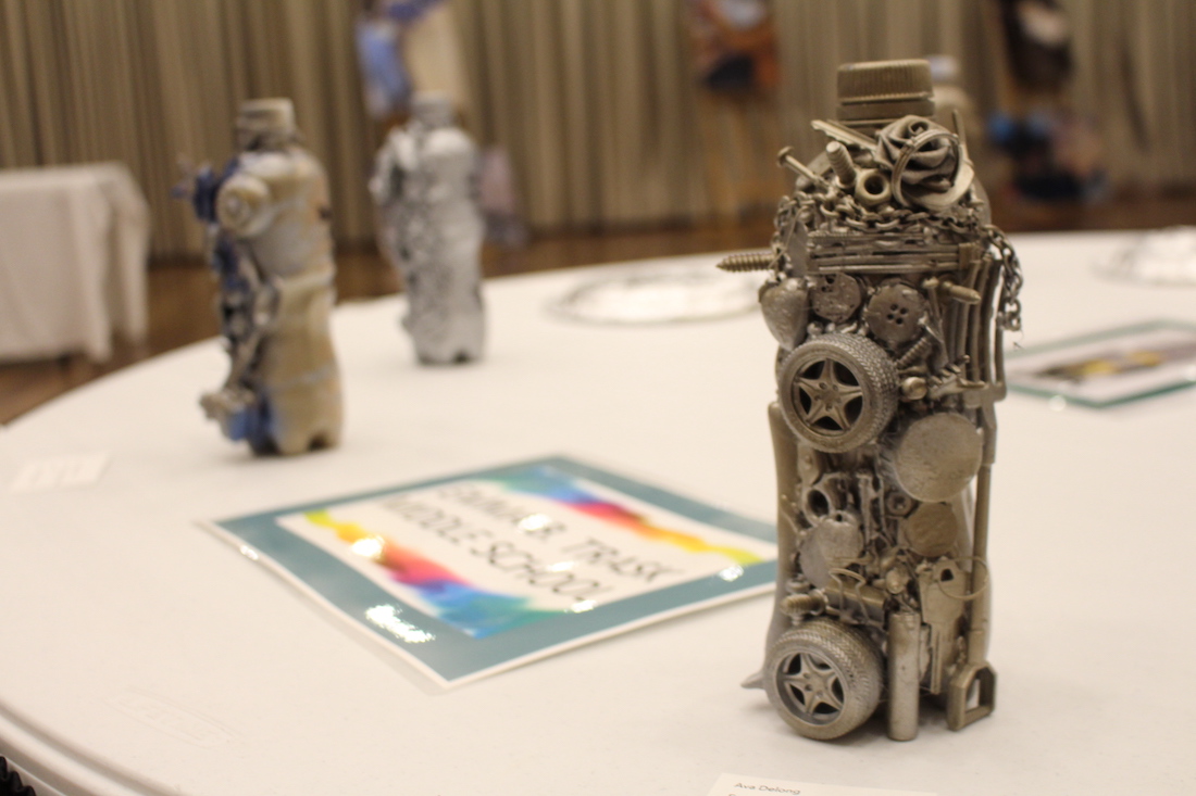 Robertson offered three arts projects for teachers to present to students. Some asked them to choose a word they most resonated with as they rebounded from something monumental in their lives. The students then created a collage out of paper plates, glue, yarn, and India ink — or they made a frame with found objects to highlight their words. Others chose to make their own “atlases” out of soda bottles and found objects. All three were created to emulate a metal sculpture like Coulter’s “Because It’s Time.”