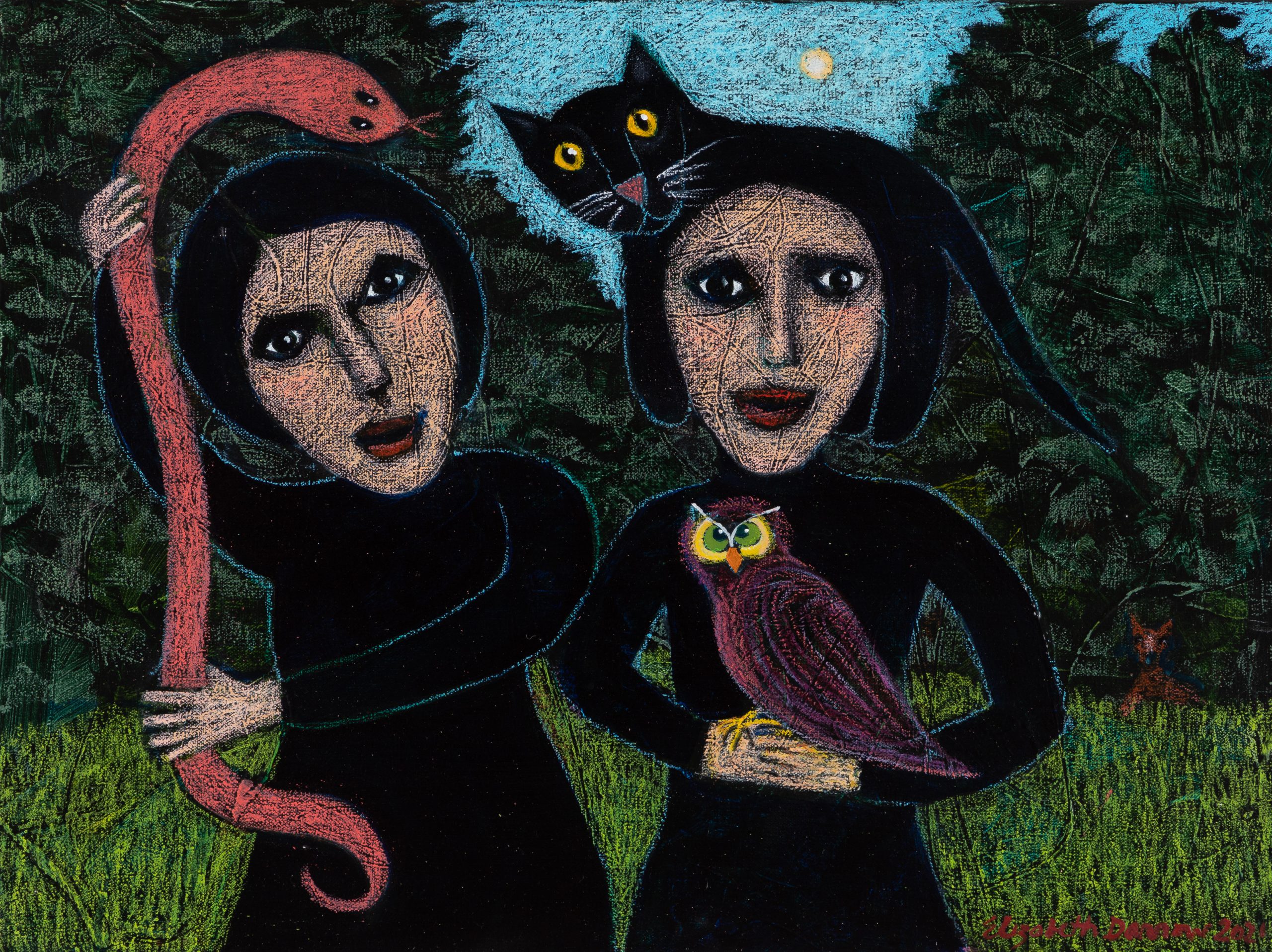 Darrow churned out 50 pieces of art during the first four months of Covid-19 isolation, creating worlds of whimsy and wonder. They are now on display in “Start With the Eyes: Elizabeth Darrow and Friends” at Art in Bloom’s pop-up gallery in Mayfaire (820 Town Center Dr.).