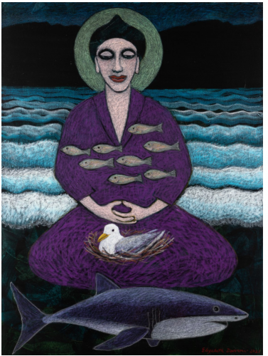 ED: I think I’d have to say “Nirvana” because it was such a surprise how it evolved, and the imagery that appeared was not something I would normally “think of” to do: the waves in the background, the fish swimming through the body, the shark and the nest and the halo. Each element came into focus as soon as I gave it my full attention. It seemed magical.