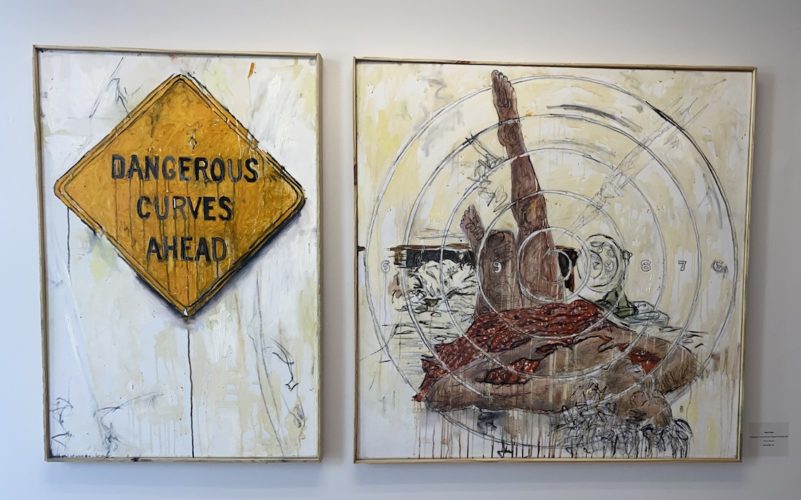 Using acrylic paint on canvas, Flake created a painting of a curvaceous woman lying on her back, with the outline of a large, white target surrounding her. A road sign takes up the other side of the canvas: “Dangerous Curves Ahead.”