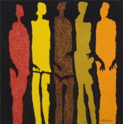 Texas artist Nii Narku Thompson, originally from Ghana, Africa, will present two pieces of work, “Twins” and “Together for Humanity.” “Twins” is acrylic on canvas and features two bold and colorful Cubist-style faces beside each other. Thompson describes this 27-inch-by-37-inch painting as “an alternate advantage. With two, there is always an availability of choice. Good for equilibrium.”