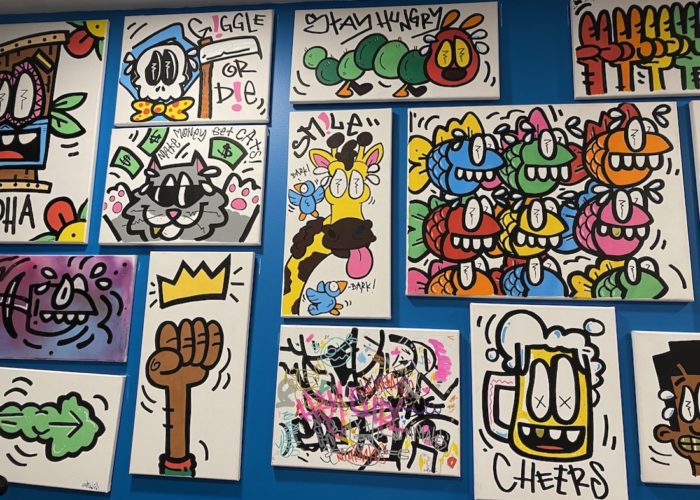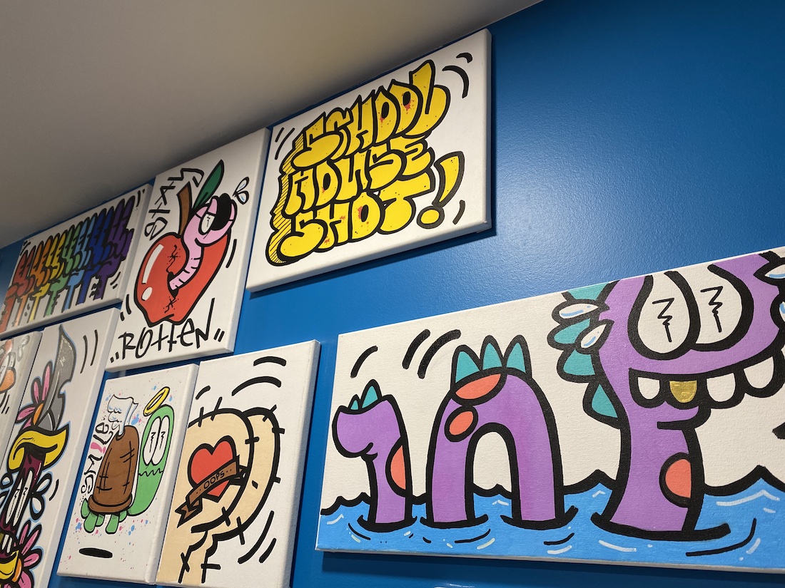 One wall is aligned with Davis’ works — pop art featuring a school of colorful funky fish, a sudsy beer with “X” eyes, and a caterpillar with the phrase “Stay Hungry.” Street art is also apparent with graffitied paintings or phrases that look “tagged” including one that says “School House Shot.”