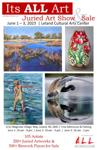 The Art League of Leland is hosting its annual event on June 1-3 at the Leland Arts Center. An opening award reception will be held for 105 artists on May 31, 7 p.m. – 8:30 p.m. Awards will be presented in 2D and 3D art and photography.