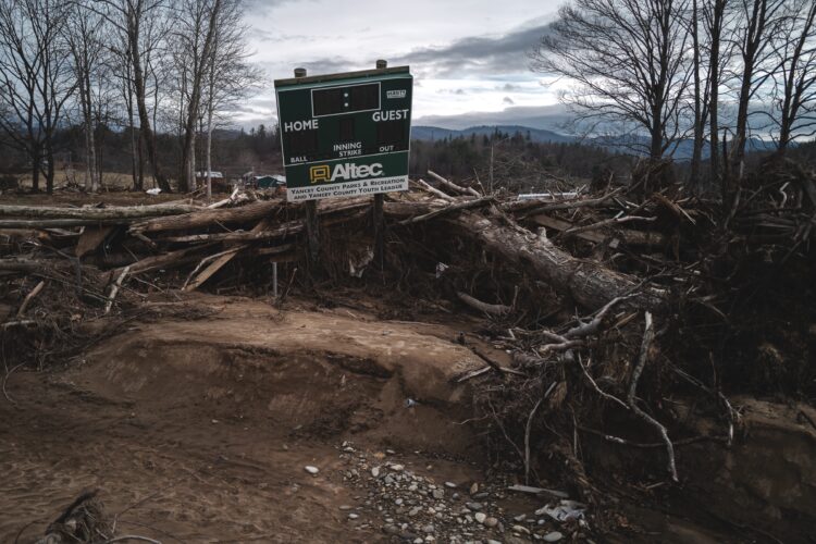 One photograph, for example, was of a baseball stadium’s scoreboard in Burnsville, North Carolina. Next to it is a photograph of a destroyed field with trees everywhere. While not ripped to pieces, the scoreboard no longer stands atop the two poles that once held it up.