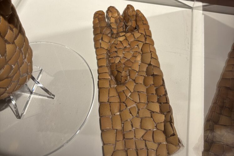 For the CAM exhibit, Diamond showcases gloves made of eggshells she collected independently, woven together over sheer fabric. The shells are linked together with string, with the broken shells round and scale-like in shape. Delicate, they are displayed in a glass case to protect it from harm.