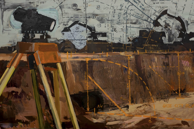 He said the smaller canvases were for more complicated scenes, like those recreating his childhood, while the larger ones were for the construction of Gate City Boulevard or maps once featured on his father’s desk; his dad was a civil engineer and owned his own land surveying firm.