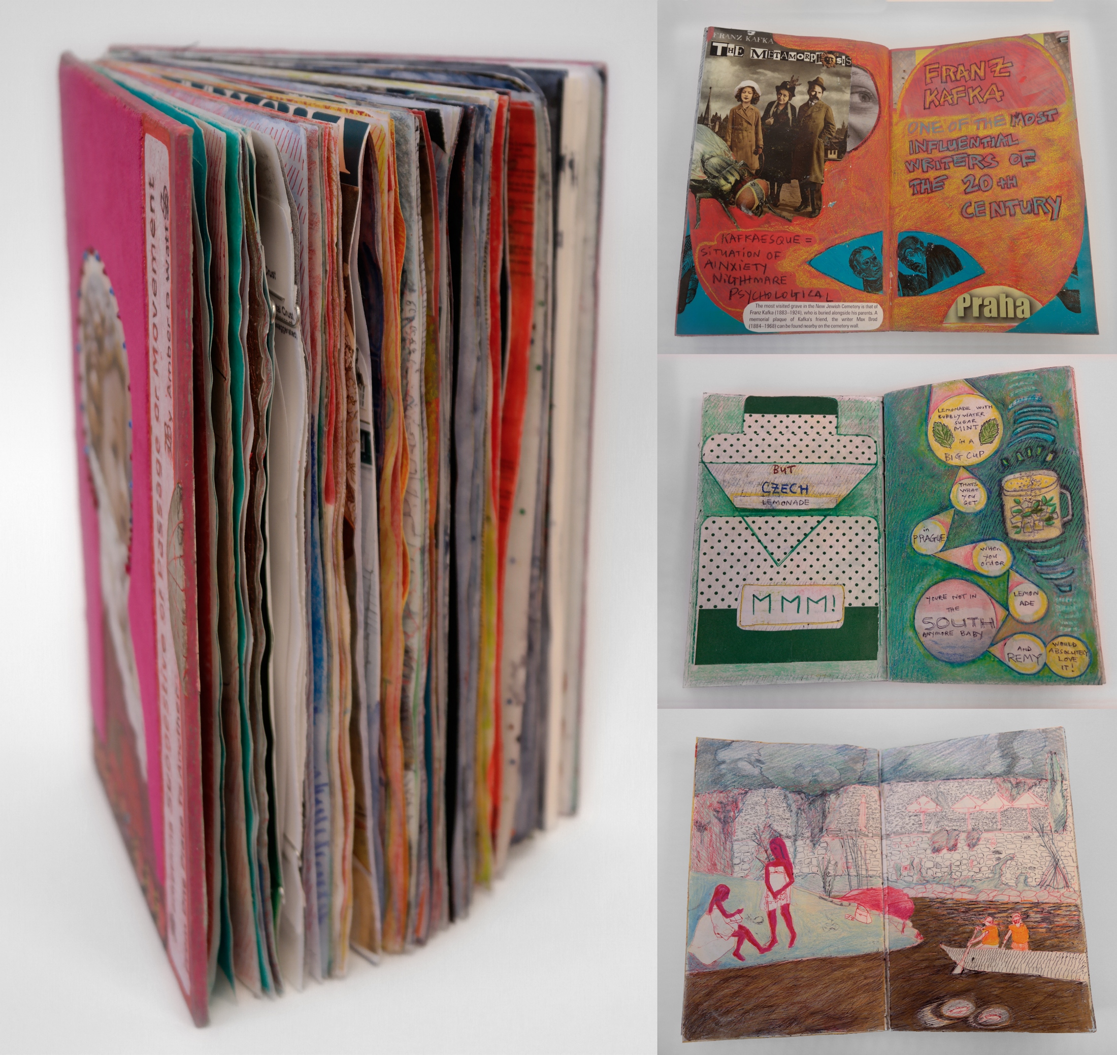 “The book is mixed-media, containing elements of drawing and collage,” Watts explained. “Pages are coated with a thin layer of paraffin wax to prevent them from sticking. I worked on the book every day, starting before my trip overseas, every night while in Prague, and completing it upon my return to the U.S.”