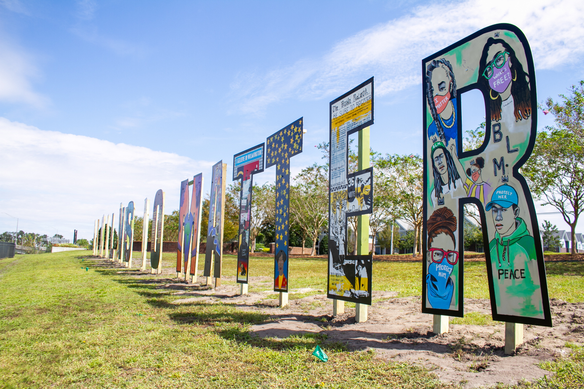 UNCW professor Janna Siegel Robertson, Greyson Davis and Cedric Harrison put together a proposal that had to go through various evolutions before landing on “Black Lives Do Matter: End Racism Now.” A group of 18 artists dubbed “Eighteen Forward” painted each 4-foot-by-8-foot letter to represent significant figures or images, such as local artist Minnie Evans and local protesters from lowercase leaders. The installation will be up through August 2021.