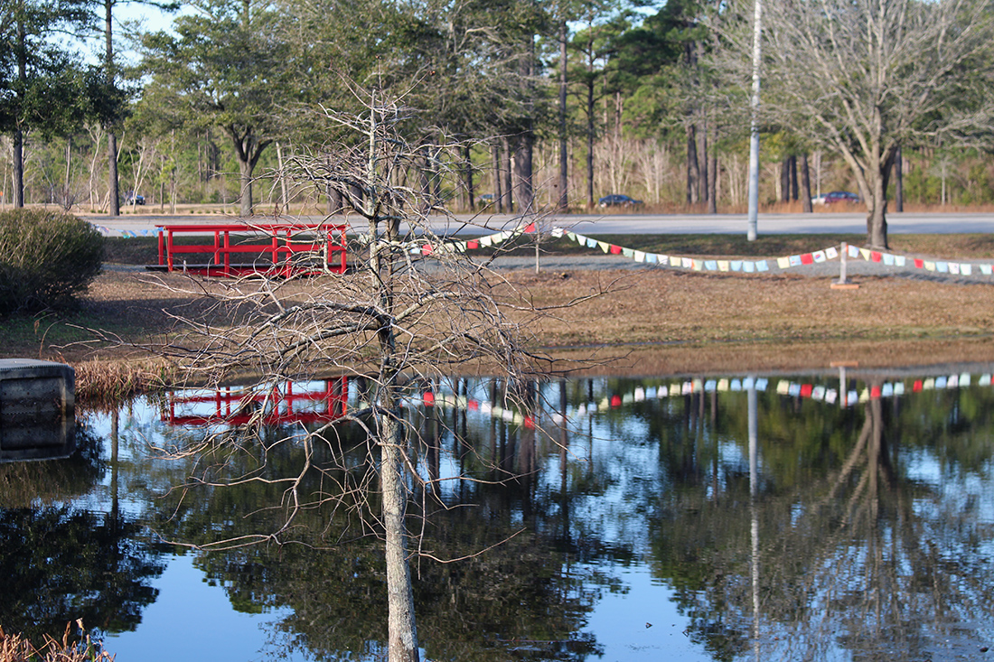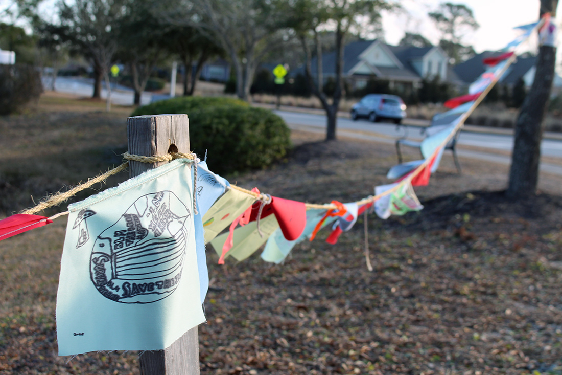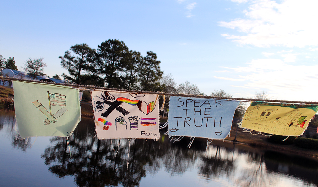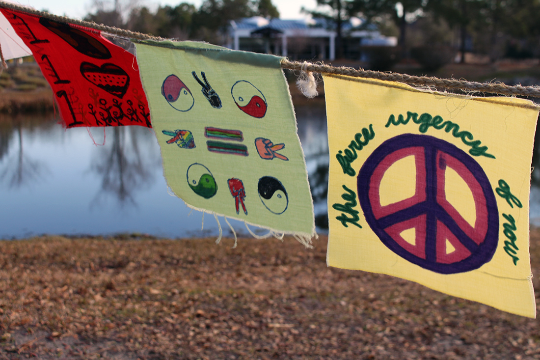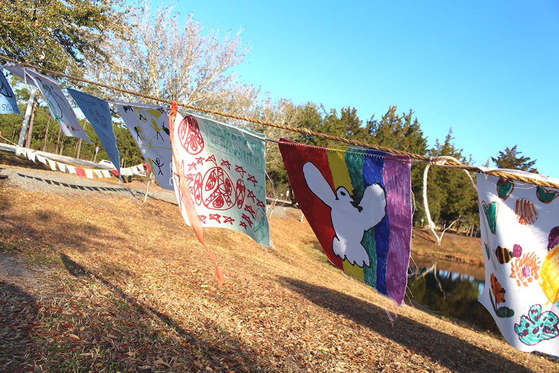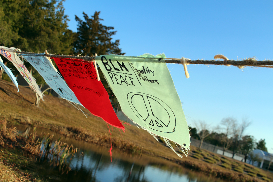 Cameron Art Museum installed peace flags created from the community to hang around the perimeter of the pond at their 17th St. Ext. entrance. (Port City Daily/Shea Carver)
