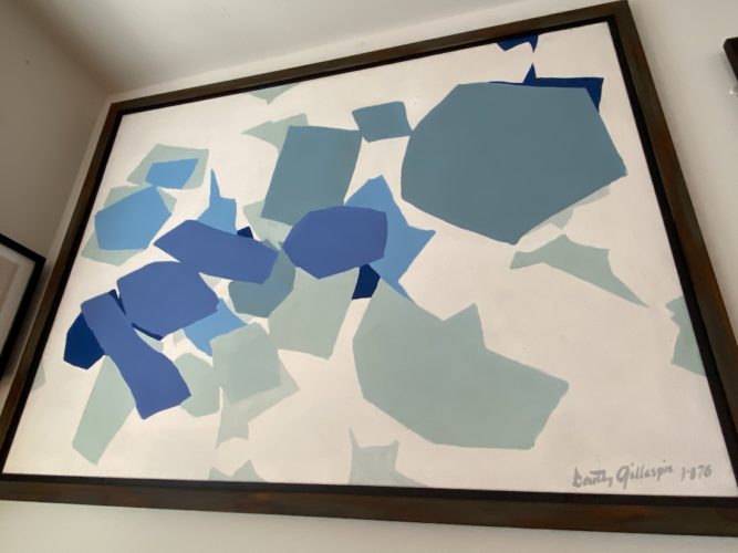 In Rivenbark’s condo on the riverfront — where he moved in the final months of his life — Gillespie’s work speckles the walls and shelves. Multiple standalone ribbon sculptures sit among painted woodblocks, and a large, rare abstract painting consisting of blue squares on canvas, created in 1976, towers over the living area.
