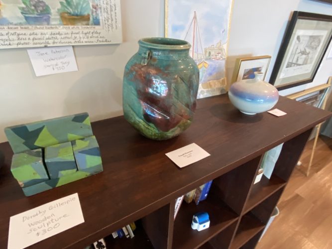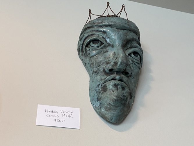 The Verwey mask Rivenbark purchased that night is for sale, alongside pieces by Wilmington artists Fritzi Huber (paper), Mark Weber (mixed-media, painter), Nick Mijak (watercolor), and Michael Van Hout (sculptor, wire).