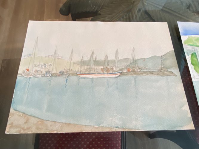 Other watercolor and acrylics on paper, one featuring images of sailboats, another landscapes and historic structures, were strewn on a table. The color palette was so light it almost seemed faded.