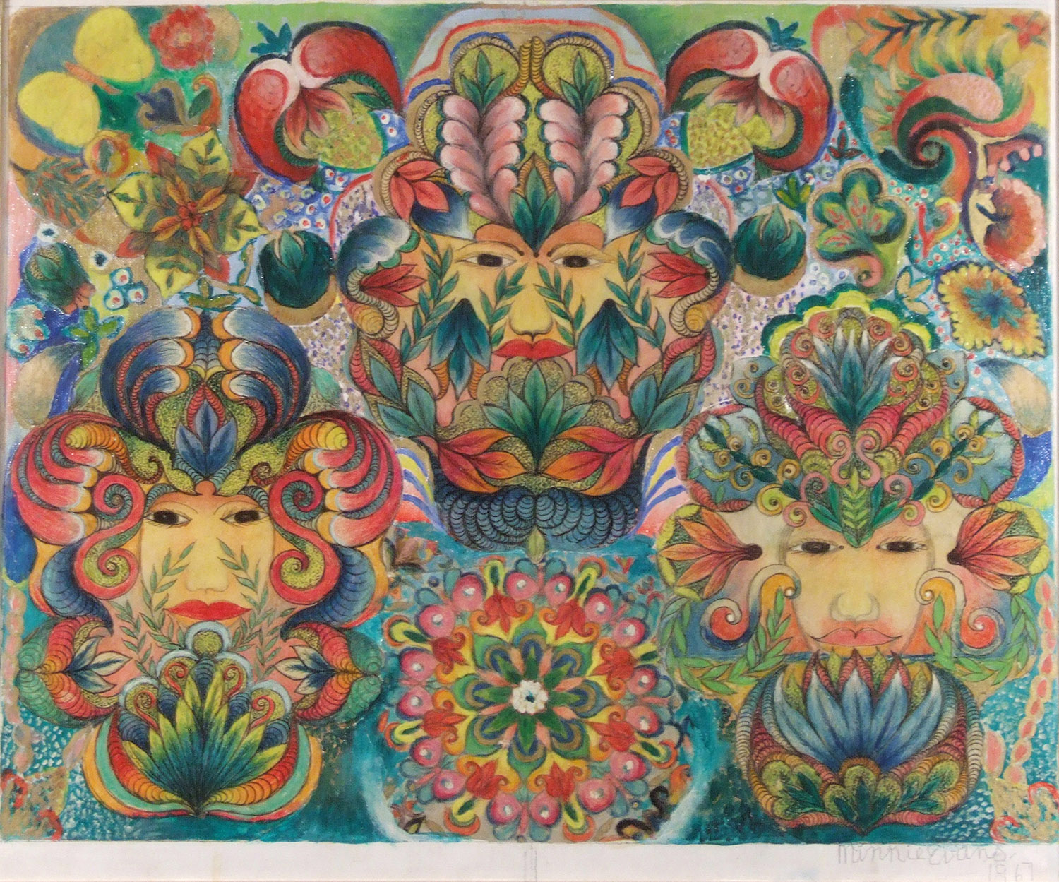 Lush foliage, butterflies, bumblebees, peacock feathers and hives appear swirled around Evans’ signature eyes and faces. The figures have been considered prophets, others appear as animals, serpents and mythical creatures. Evans’ drew landscapes and supernatural scenes, described as both surrealistic and Southern folk.