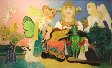 A green monster is showcased in both, one paired with a white dove, the other a winged white horse. The work is flanked by birds, vegetation, peering eyes, and smiling faces, in an “explosion of fanciful forms wheeling in the pink-orange sky,” as “flower-like shapes seem to spin the air and emerge out of telescoping forms,” Penton described.