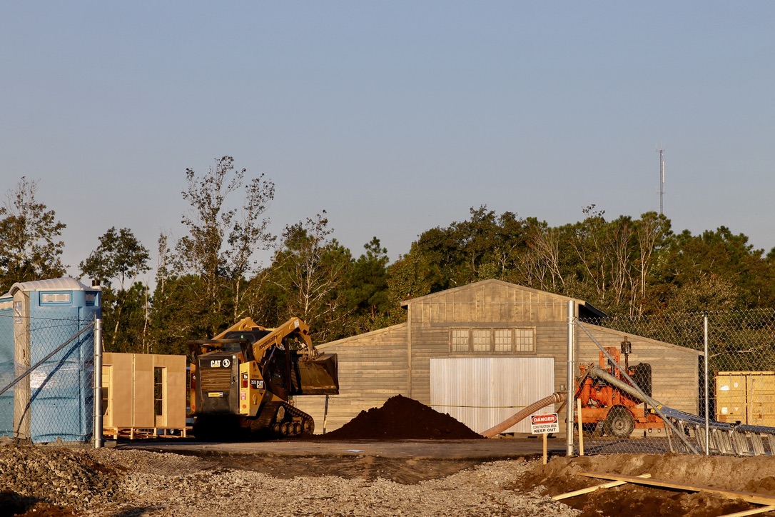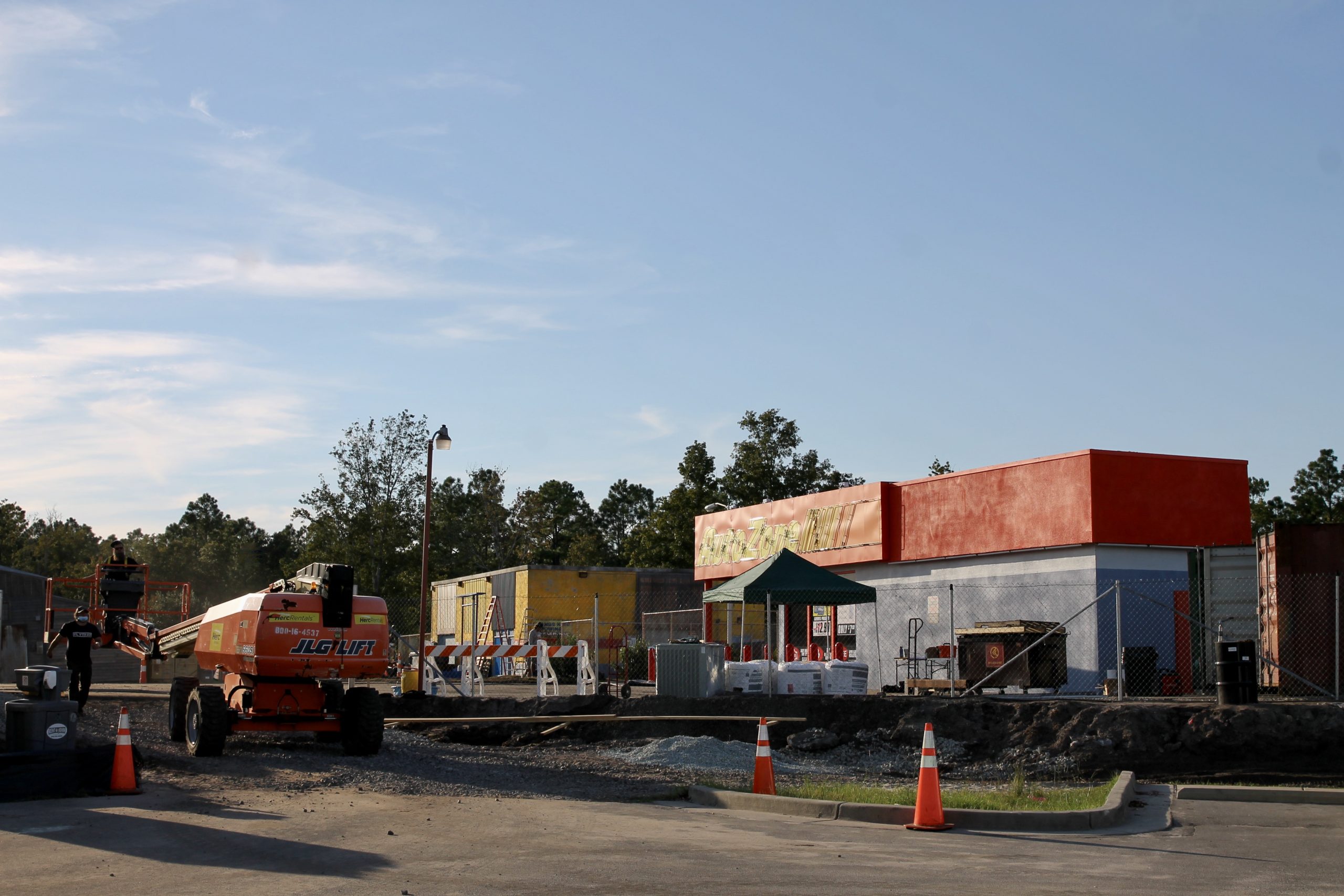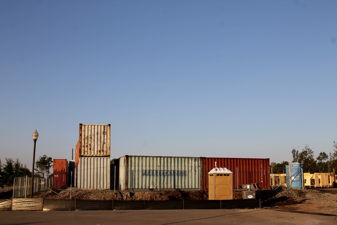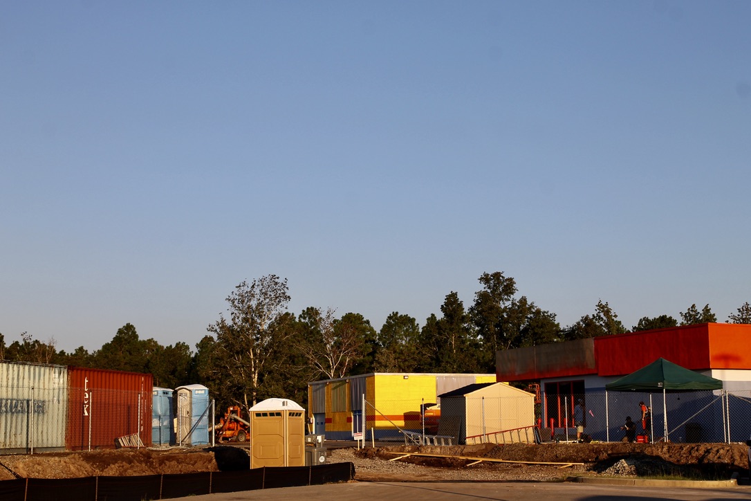 A portion of the shopping complex that was once empty is now home to multiple trailers, portable toilets, stacks of plywood, construction equipment and a crane lifting stage lights over the lot. Surrounded by a chain-link fence, a combination of random building façades have been constructed on the property: a fake AutoZone, a brown barn-esque structure, a building with cross detailing. Cargo containers are stacked along the outskirts, barricading the set from the movie theater and nearby restaurants in The Pointe.