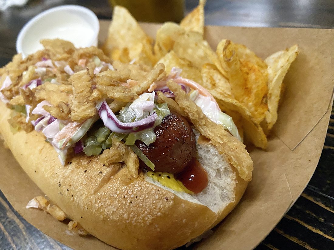 The Chevy Dawg — named after Taylor and his wife’s boxer that passed away a few years ago — is a quarter-pound Angus beef dog, served on a hoagie roll with homemade slaw, house dill-pickle relish, mustard, ketchup, and fried onions.