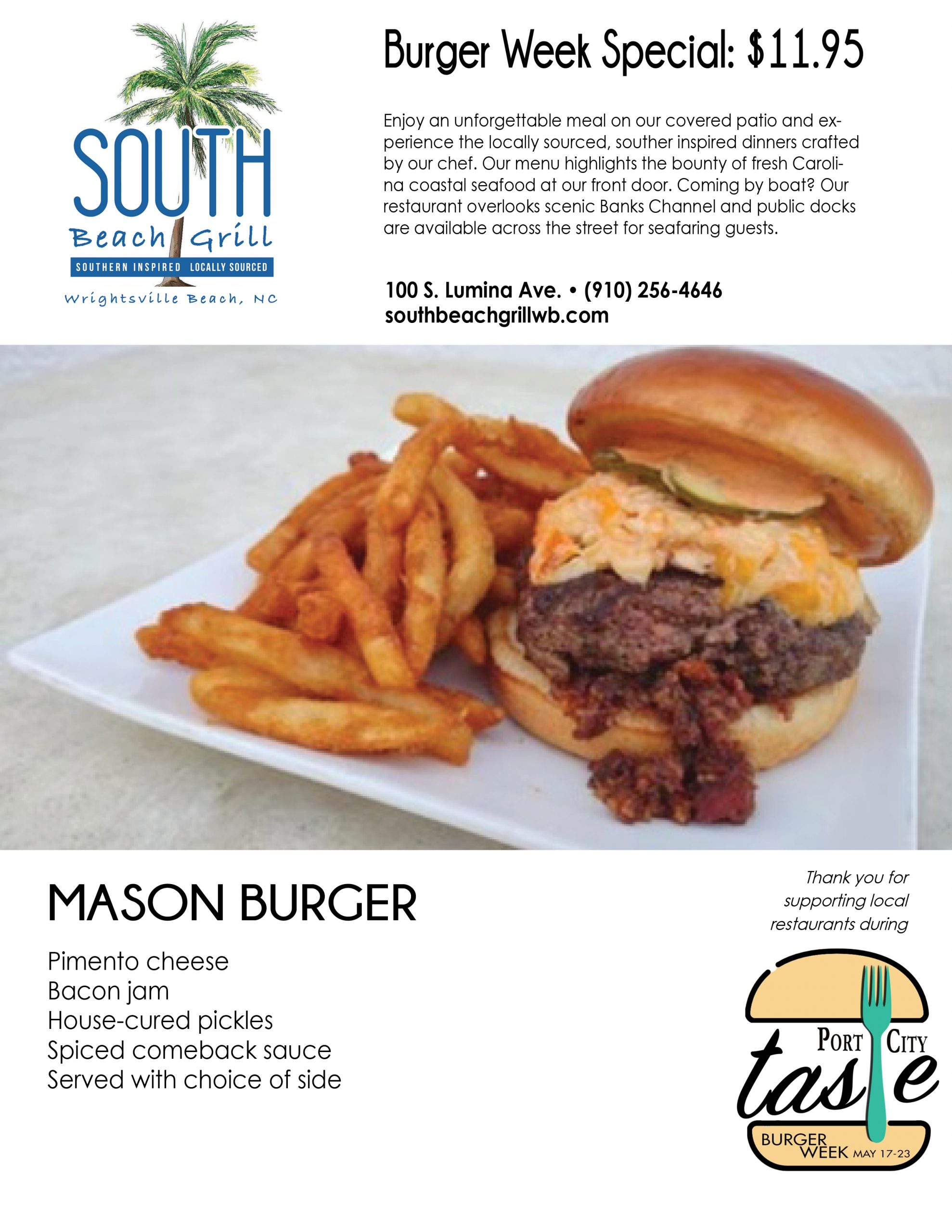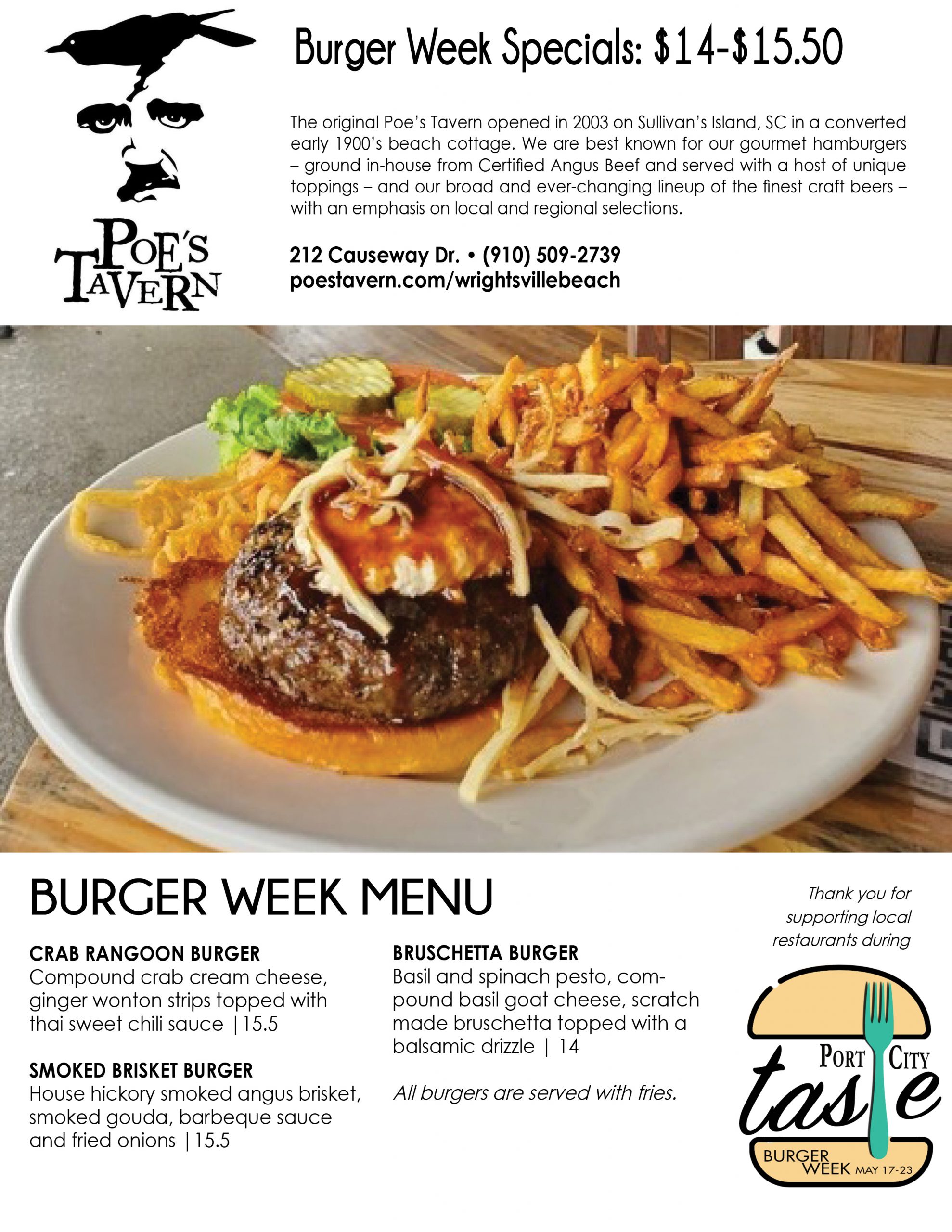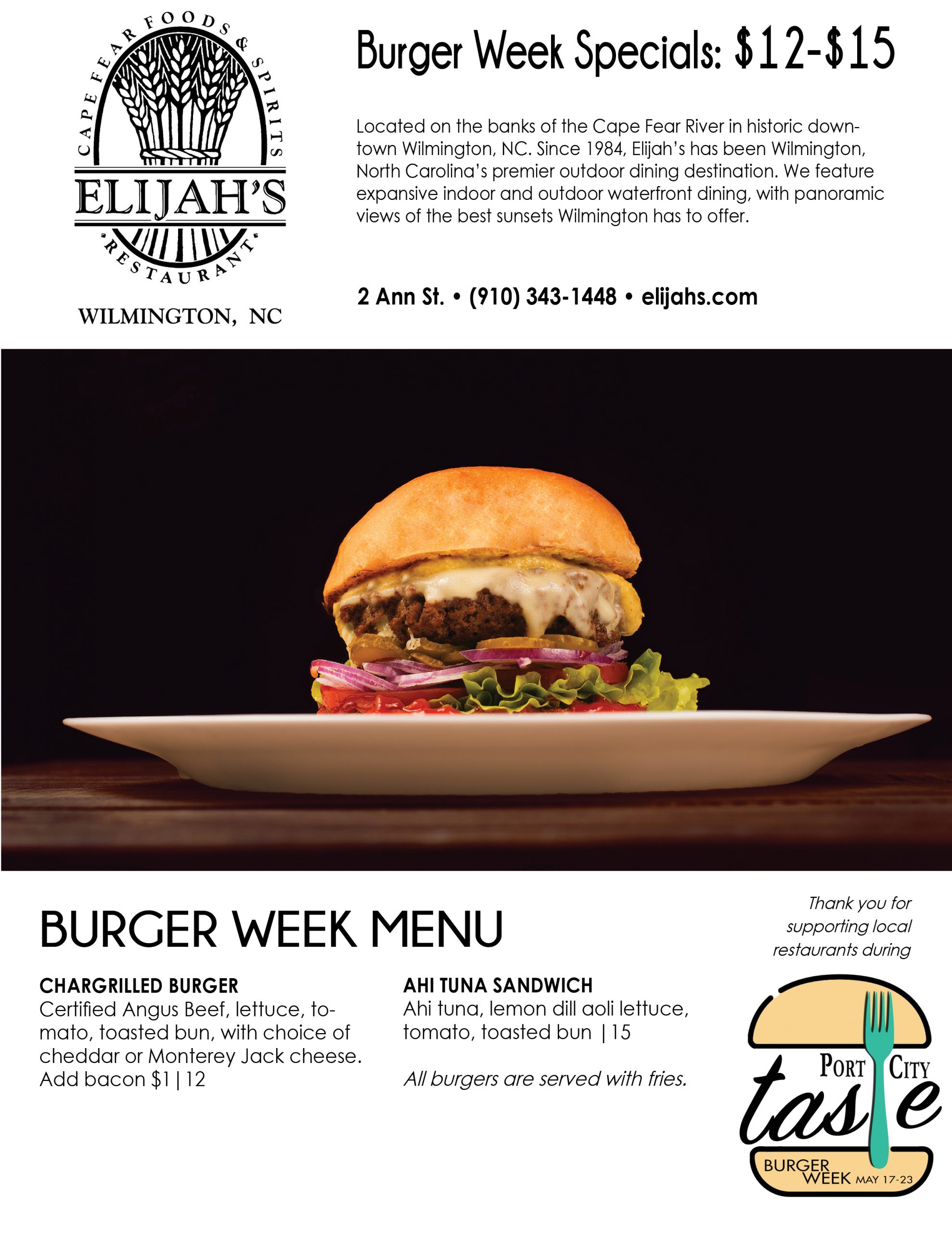 Interested diners can check out most menus offered during Burger Week below, and check in throughout the week for updates by clicking the Port City Taste tab on the Port City Daily website. At the end of each menu featured under the Port City Taste tab, readers can choose to print, download or email it to friends to plan their week of eats.