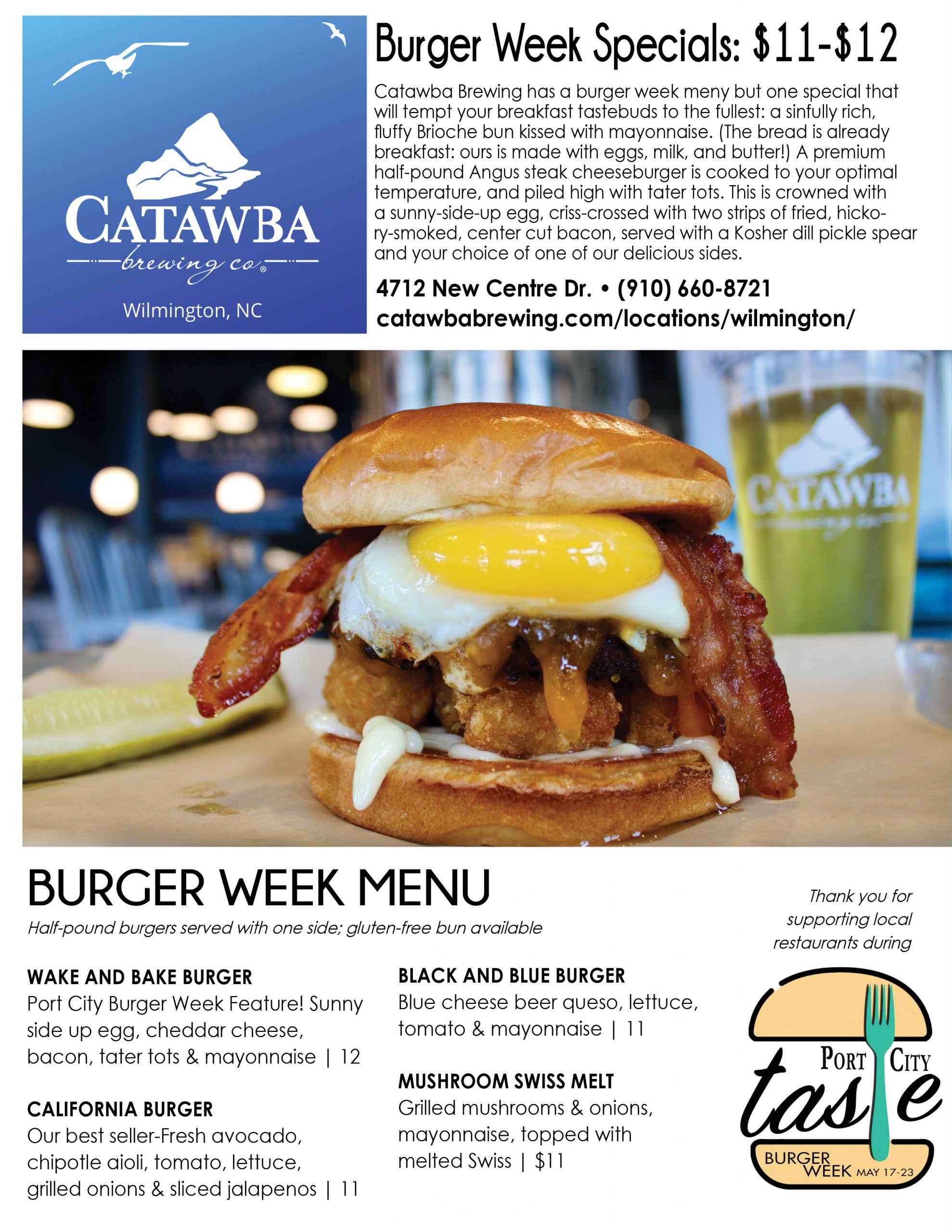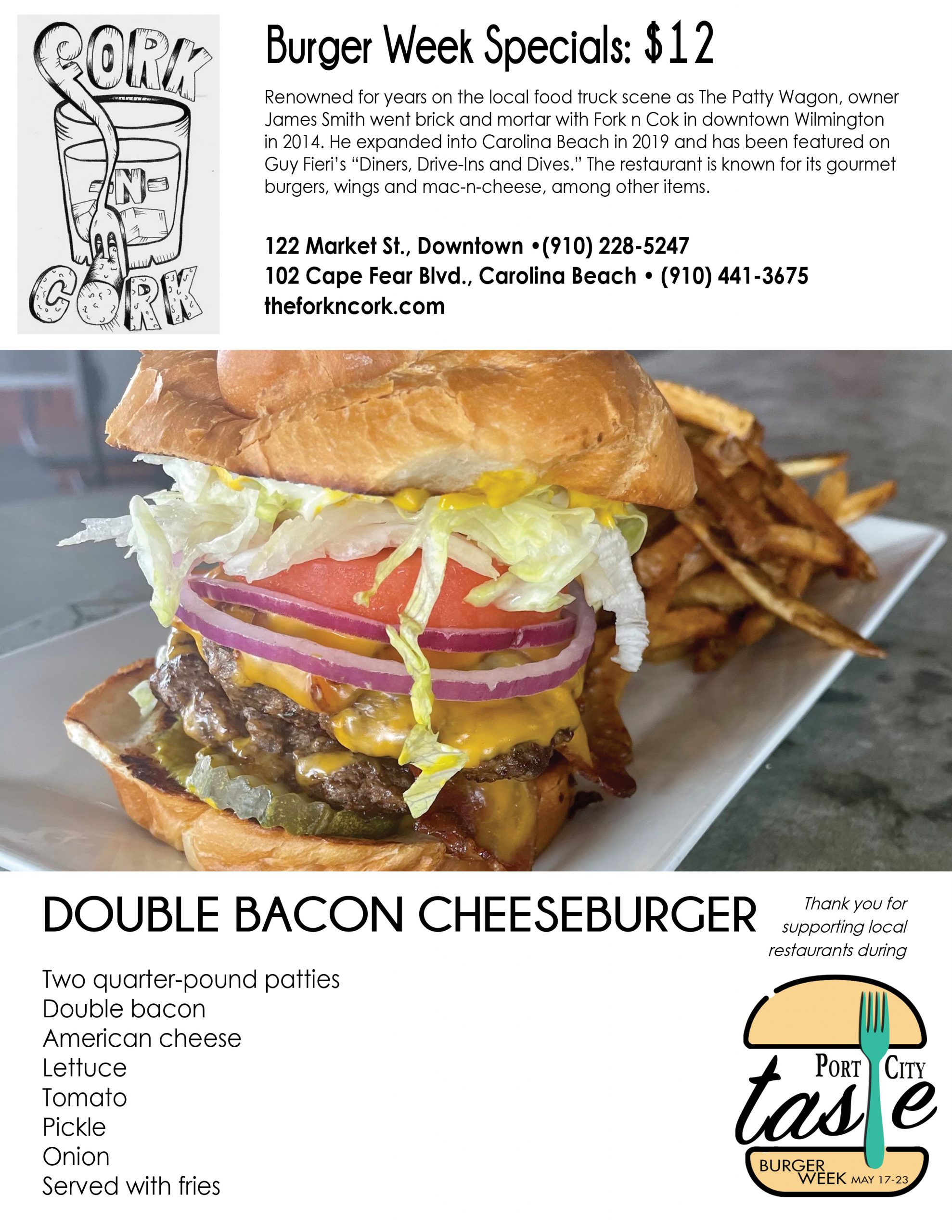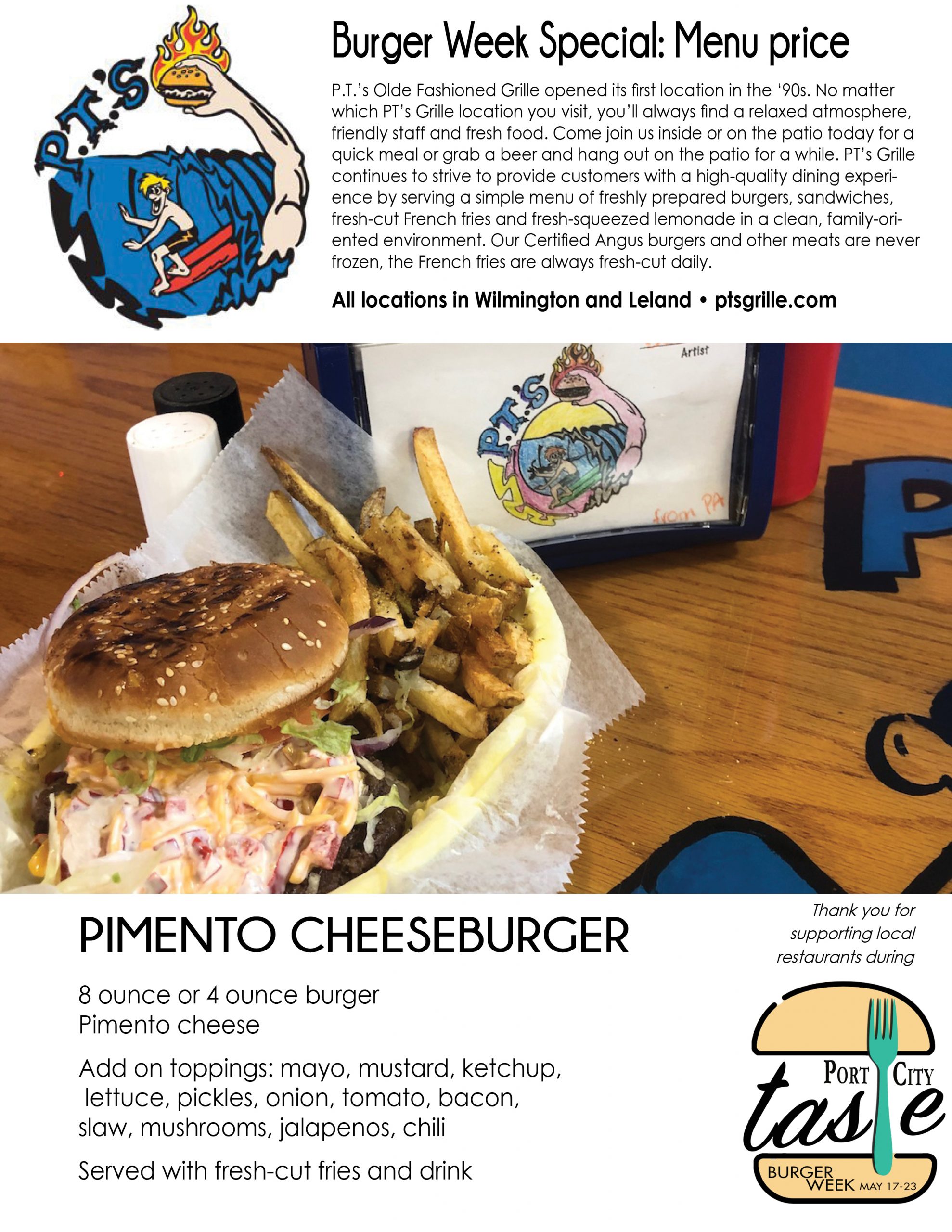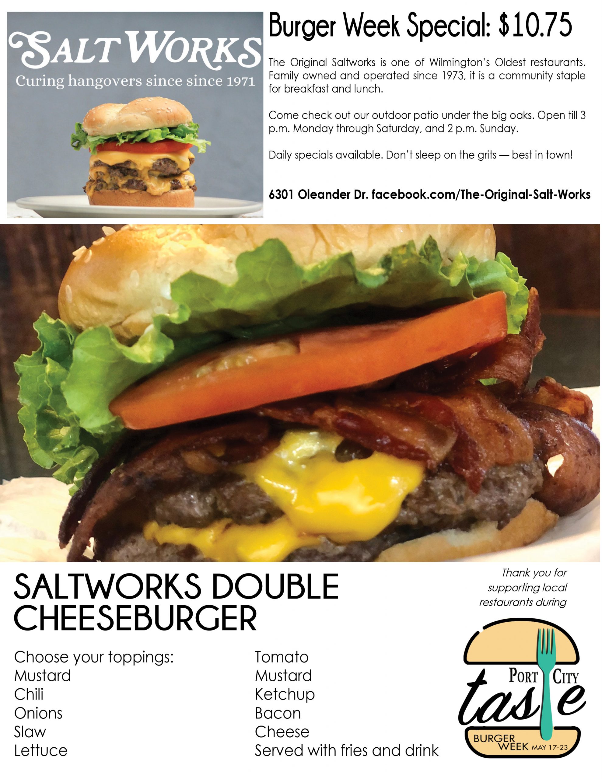 Port City Taste is celebrating it in all its flavors and styles across the Cape Fear this week, with the inaugural Burger Week. A Port City Daily event, it kicks off Monday, May 17, and ends Sunday, May 23, providing seven days for diners to eat their way through upward of 30 participating restaurants in southeastern N.C. Burgers will be served at eateries from north to south Wilmington, Carolina to Wrightsville beaches, midtown to downtown to Leland.