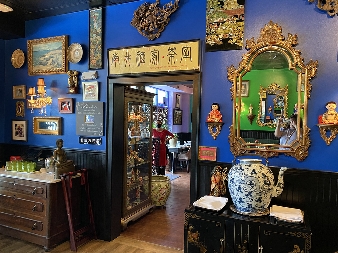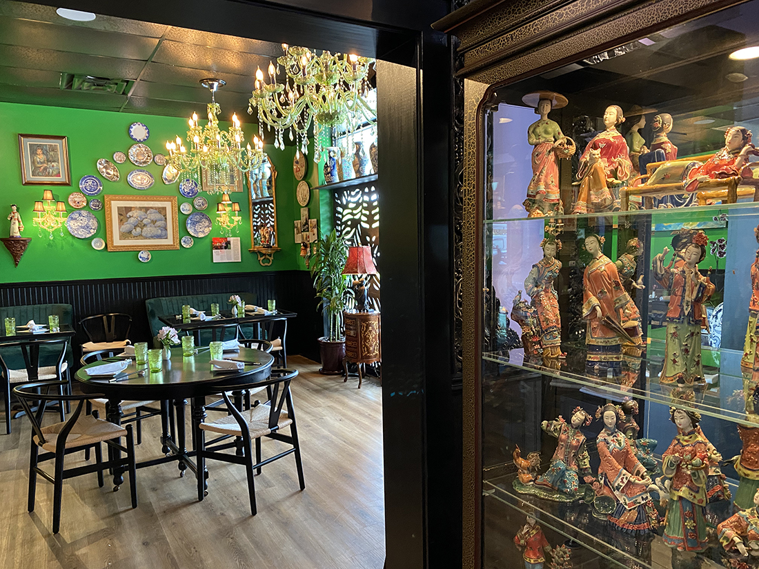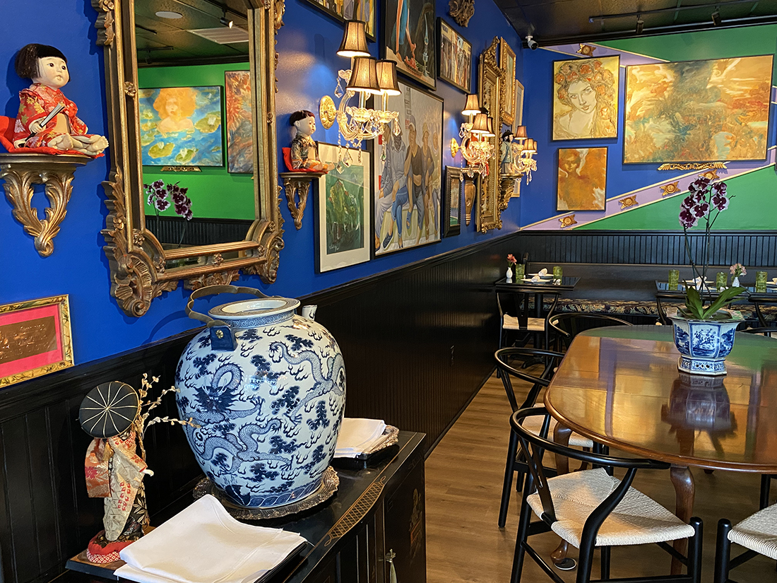 Located in Fulton Station in the Pine Valley area, the unassuming strip mall harbors a secret hideaway of 1,500 square feet, filled to the brim with Asian art and artifacts. Thompson secured Chinois’ neighboring space — the former Coastal Carolina Driving School, which moved a few doors down — to begin renovations three months ago. She depended once again on the help of her friend and interior designer Denis Castro to transform the additional dining area.