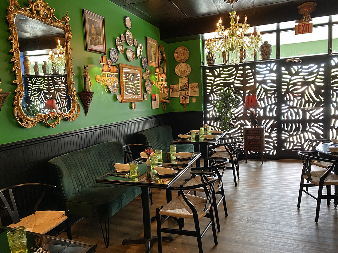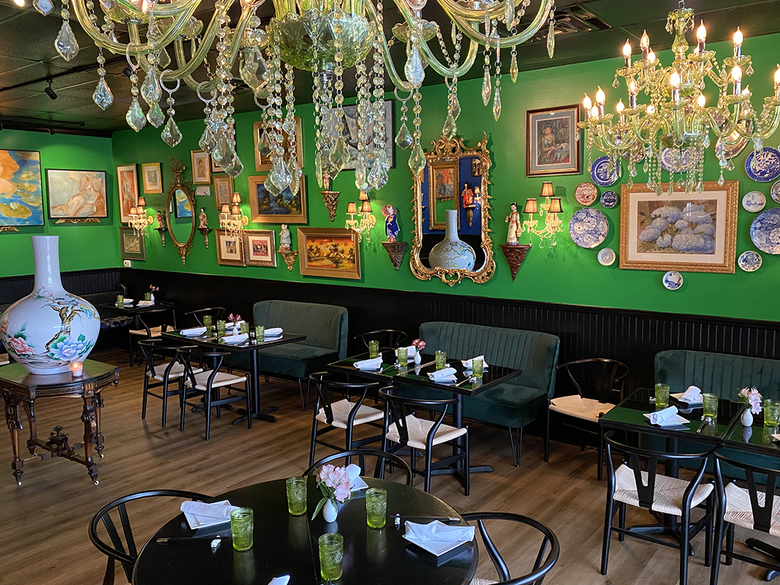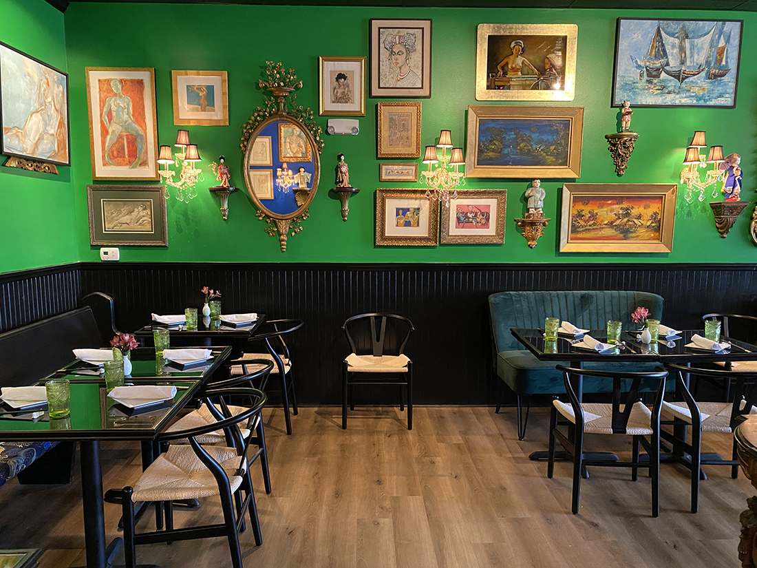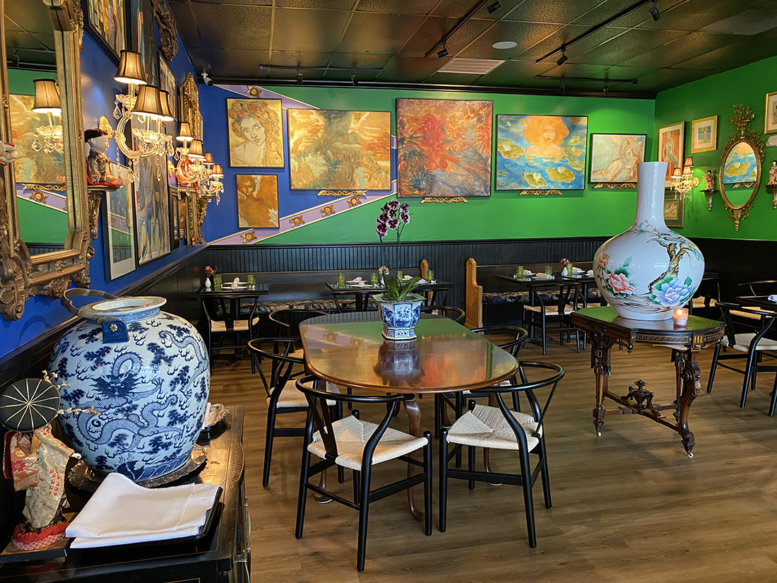 Located in Fulton Station in the Pine Valley area, the unassuming strip mall harbors a secret hideaway of 1,500 square feet, filled to the brim with Asian art and artifacts. Thompson secured Chinois’ neighboring space — the former Coastal Carolina Driving School, which moved a few doors down — to begin renovations three months ago. She depended once again on the help of her friend and interior designer Denis Castro to transform the additional dining area.