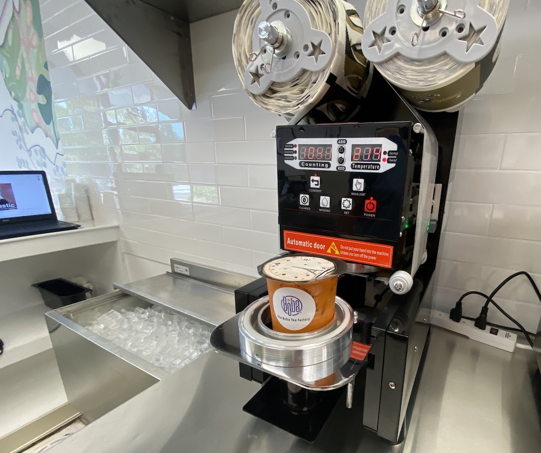 She turned a boba tea ever so delicately in its plastic cup, sealed in a machine on site. Each cup is topped with cellophane, to prevent the drink from spilling as Gao turns it to mix, the chewy pearls dotting the cup.