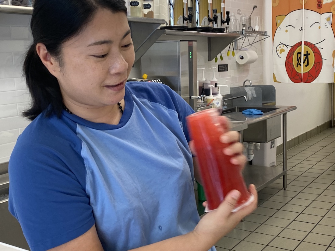 Containers of fruit concentrate — mango, watermelon, blueberry, strawberry — are positioned under urns of black and jasmine green tea. Nearby are the boba tapioca pearls, made of cassava starch, a root vegetable from South America. Gao orders all of the ingredients from a distributor in Taiwan.