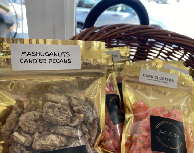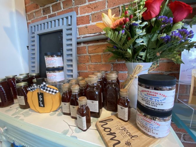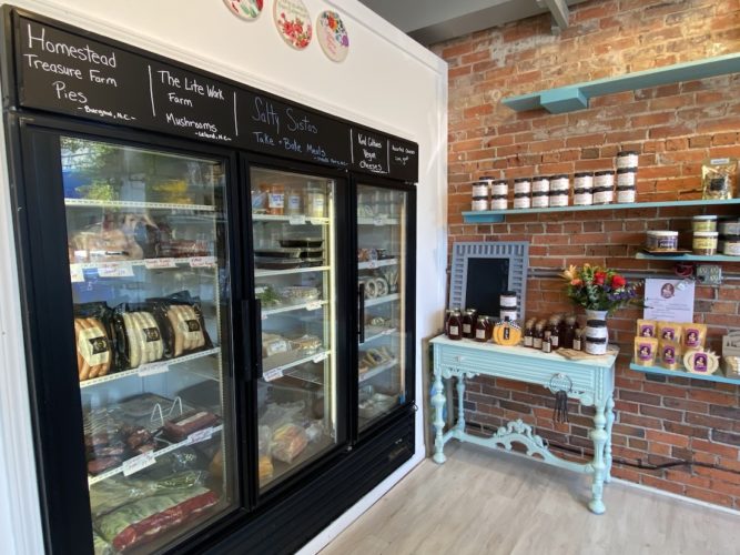 Shelving and display tables present local honey from Wilmington’s Sweet Life Honeybee Farm, Queen Esther Herbal Teas, Burgaw’s Homestead Treasure Farm breads, and Carolina Crisp Cookies. Stone-ground grits and fried-green tomato batter are situated between Outer Banks’ seafood boil spices, while Mancini pasta and Bulletproof tomato-basil sauce is in front of fresh basil and chives planted amid baskets of onions and tomatoes, oranges and apples.