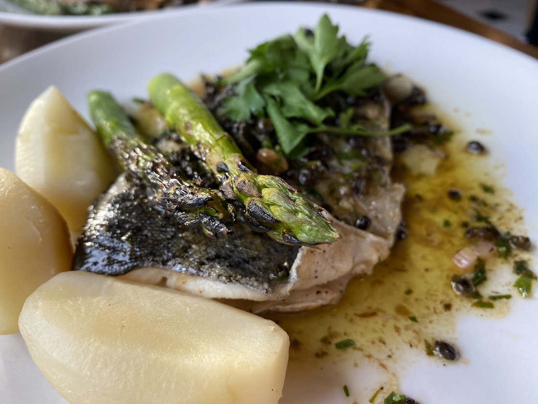 “Loup de Mer et Chair de Crabe” is the technical name — sea bass floated in a touch of olive oil and lemon juice, salt and pepper, served with turned potatoes and julienne vegetables and topped with crab meat.