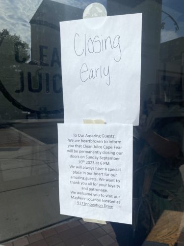 Clean Juice shuttered its downtown location at the corner of Grace and Front streets on Sunday, Sept. 10. A note tacked to the door thanked customers for their “loyalty and patronage.” The Mayfaire location will continue to operate, according to owner Lane West.