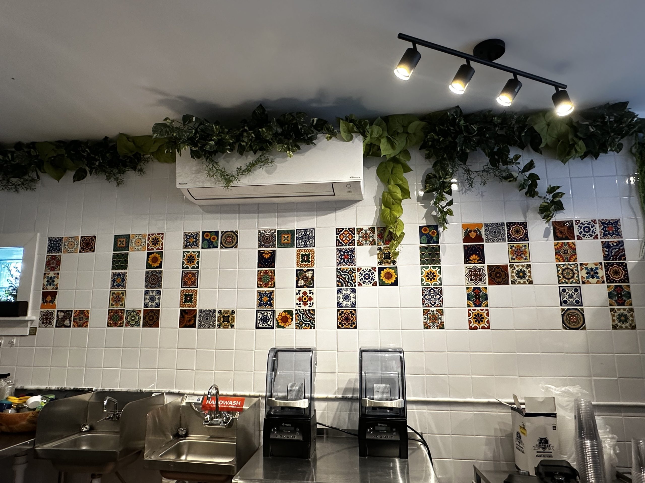 The couple aspires for the shop to be a tranquil place for their customers. The smoothie bar is made of wood-fired bamboo that the couple harvested from a friend’s yard in Fayetteville and prepared themselves. Woven basket lights, collected during travels in Kenya, hang above the bar. They also installed a mosaic logo made from tiles sourced from Mexico.