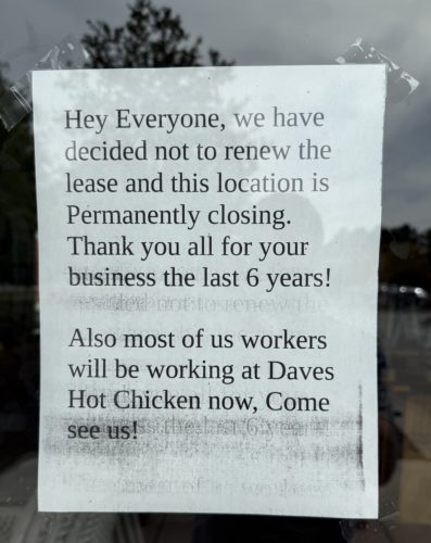 A note pinned to the door Wednesday indicated most employees were moved to Dave’s Hot Chicken, located in front of Independence Mall on Oleander Drive. Hansen did not answer how many employees that included but he also operates the local Dave’s, which opened in 2022.