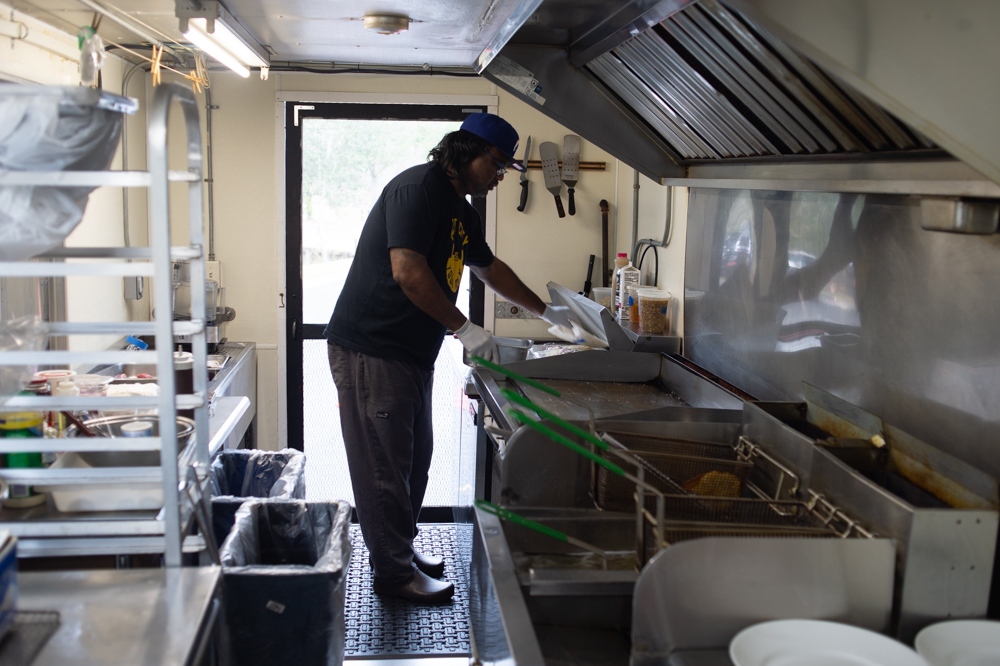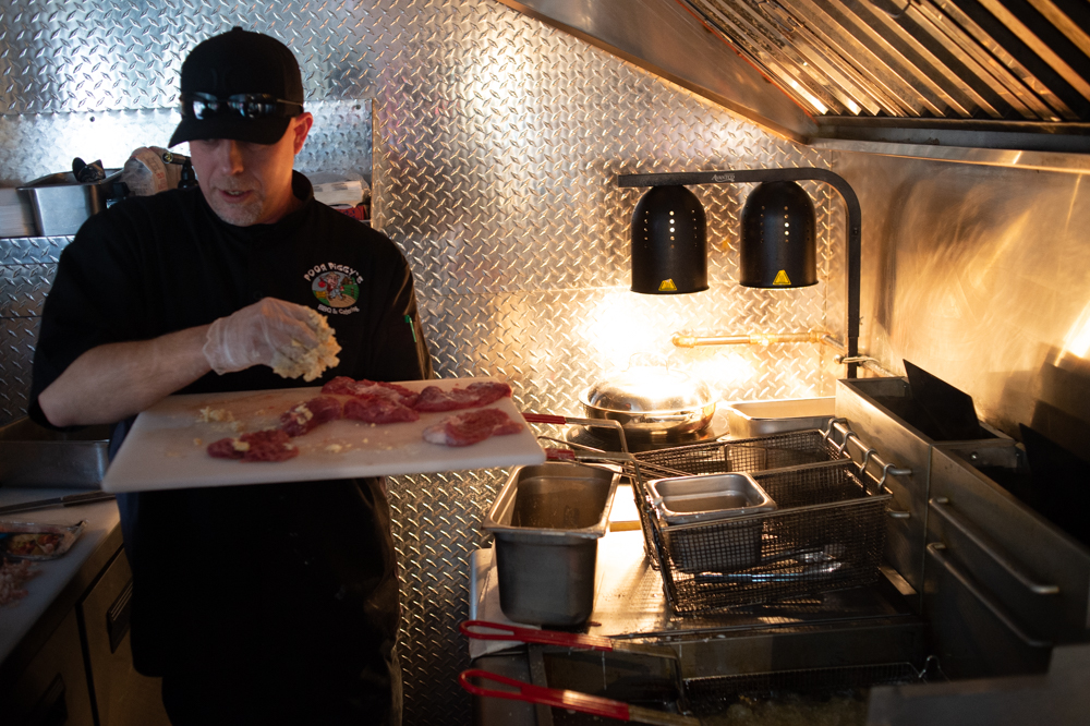 Harvey Bruce, owner of Poor Piggy’s BBQ and Goin’ Ham food trucks, prepares the pork tenderloin for deep frying. (Port City Daily photo/Mark Darrough)