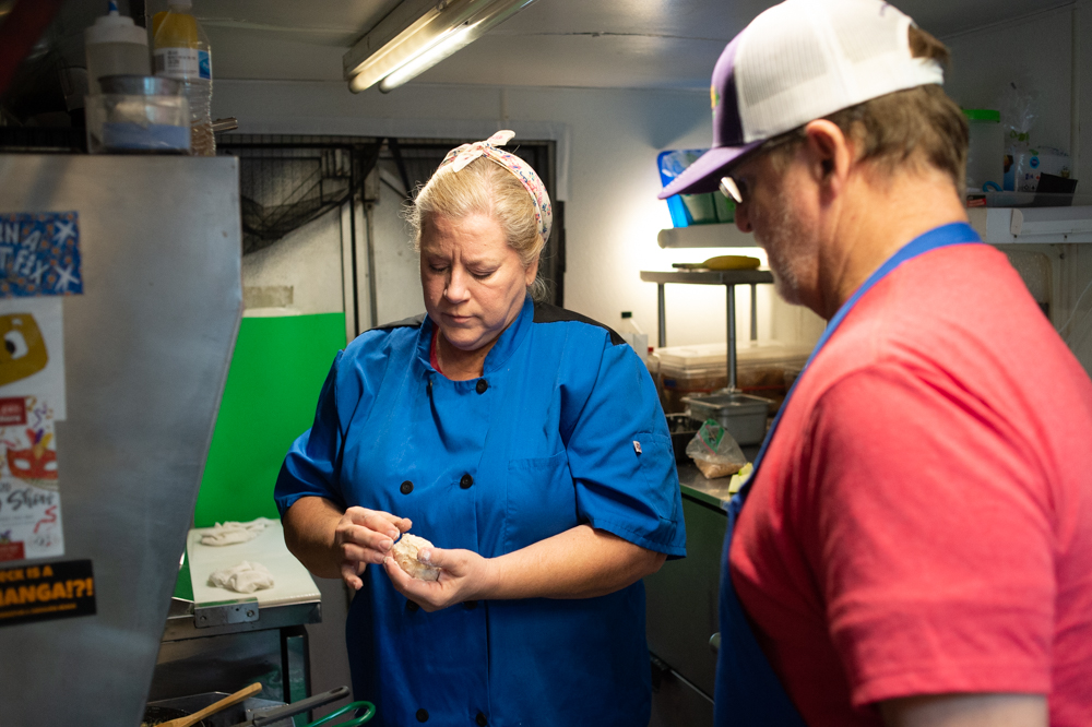 Michelle Rock of T’Geaux Boys gets ready to fry stuffed fruit beignets. (Port City Daily photo/Mark Darrough)