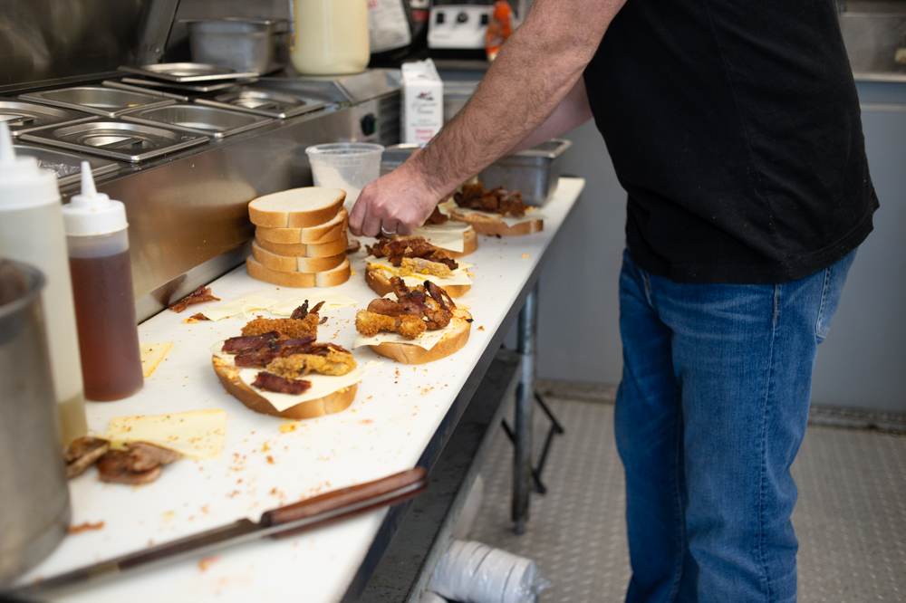Brendan Curnyn of CheeseSmith makes grilled cheese with fried pork tenderloin, pimento cheese, mustard cheese, bacon, and maple syrup. (Port City Daily photo/Mark Darrough)