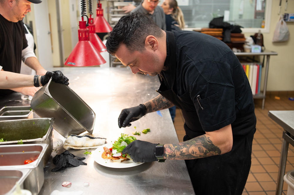 Meanwhile in the kitchen, Tyler Florence’s team worked with Christi Ferretti of Pine Valley Market to prepare the main dish for the fundraiser breakfast. (Port City Daily photo/Mark Darrough)