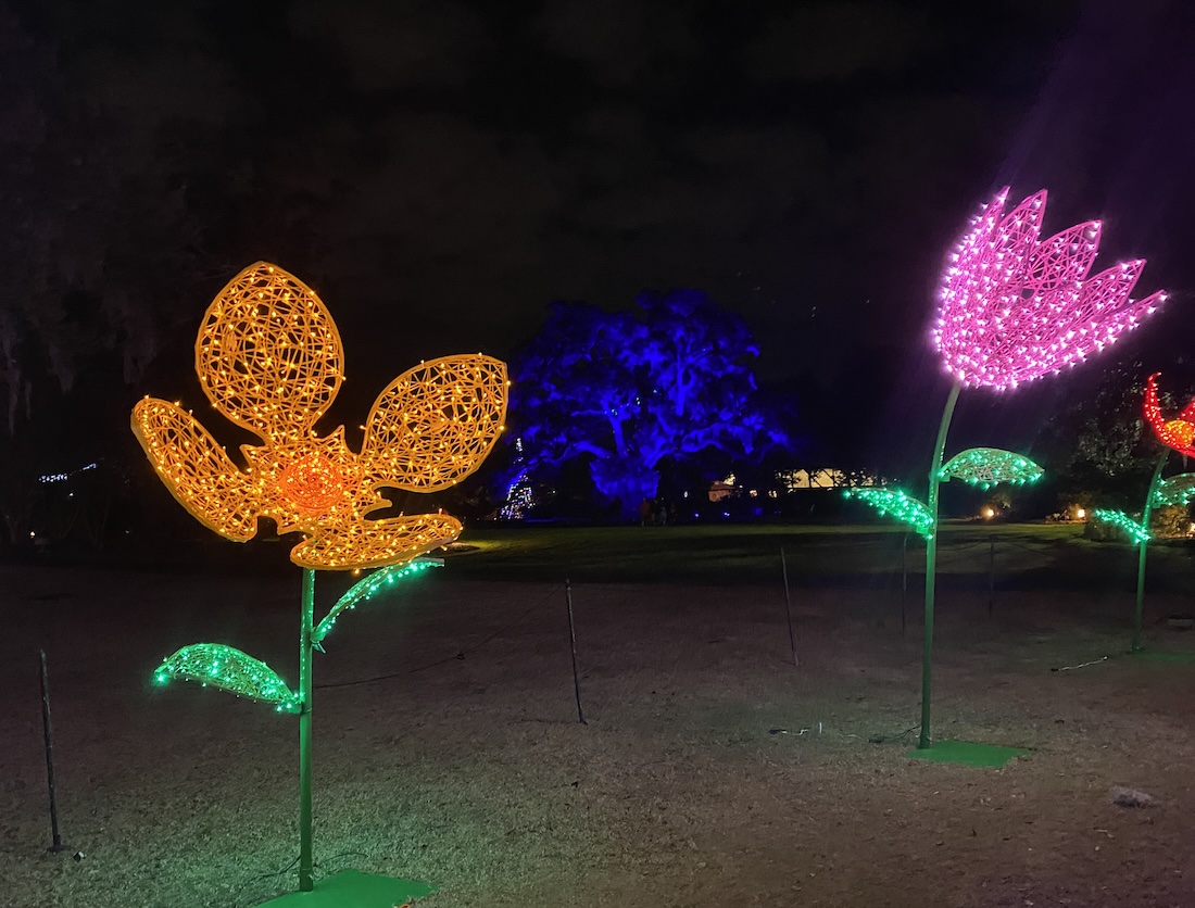 Each holiday season, more than a million lights sparkle and shine across the park — such as on the landmark 400-year-old Airlie Oak and the Minnie Evans Bottle House. Crews begin stringing them on the 67 acres, starting each summer.
