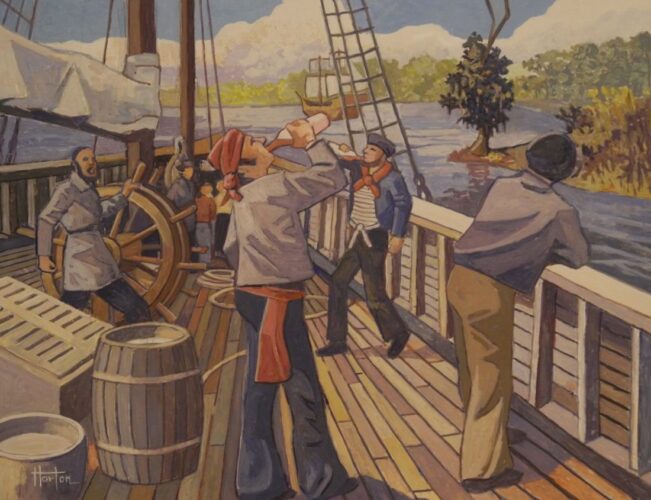 Horton works in various media, including oil, gouache (opaque watercolor), graphite pencil, and acrylic. “Legends and Landmarks” feature landscape and water scenes, as well as interpretations of historical events and places, celebrating 250 years of American history with storied subjects of Wilmington and beyond.