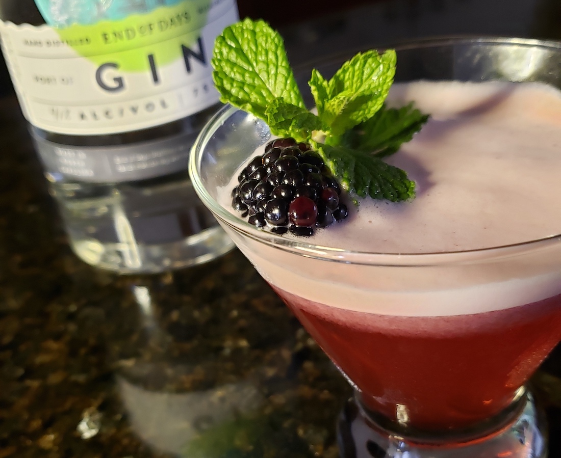 Available at True Blue Butcher and Table, Spanish Gin and Tonic: End of Days’ gin, Fever Tree Mediterranean Tonic, $13. (Port City Daily/Courtesy True Blue) Available at Rx Restaurant, Zac’s Green Ginger Aid: End of Days gin, American Dreams cucumber ice cube, lemon, ginger beer, Meg’s Scarlet begonia, $14. (Port City Daily/Courtesy Rx)Available at Rx Restaurant, C. Bee D’s Knees: End of Days gin, lemon, Terra Vita “Hot Blonde” CBD hemp-infused honey, $14. (Port City Daily/Courtesy Rx)Available at Pour Taproom, EOD Negroni: End of Days gin, American Dreams cucumber ice cube, lemon, ginger beer, Meg’s Scarlet begonia, $14. (Port City Daily/Courtesy Pour Taproom)Available at CAM Cafe, Pinkies’ Punch and The Shadow Martini. Pinkie’s Punch: Watermelon rum, fresh watermelon and lemon juice, topped off with a slice of watermelon, $13. Shadow Martini: End of Day’s vodka, crème de cassis, Kahlua, teaspoon activated charcoal, and ginger beer, garnished with blackberries, $13. (Port City Daily/Courtesy of CAM Cafe)Available at Front St Brewery, End of an Era: End of Days of gin, sour mix, simple syrup, dash of water, muddled blackberries, mint, shaken with an egg white, $10. (Port City Daily/Courtesy of Front St. Brewery) Available at Poe’s Tavern, Marie Rogêt: End of Days rum, pineapple juice, fresh lime juice, coconut syrup, grand marnier, orange juice, and nutmeg, $10. Masque of The Red Death: End of Days Gin, sweet vermouth, muddled orange, cherry juice, and Aperol, $10. (Port City Daily/Courtesy Poe’s Tavern)Available at Sweet n Savory, Lavendar Jalapeño Lemonade: Rum, lavendar syrup, jalapeño extract, and housemade lemonade, $7. (Port City Daily/Courtesy of Sweet n Savory)