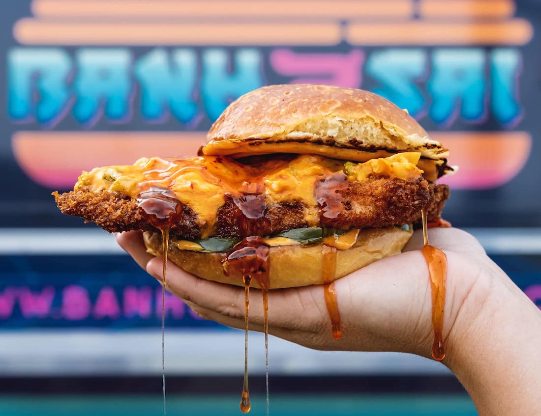 Katsu means panko-crusted. One of Banh Si’s sandwiches, “The Kano,” features katsu pork, kimchi pimento cheese, hot honey, pickled jalapeños, and the house aioli.