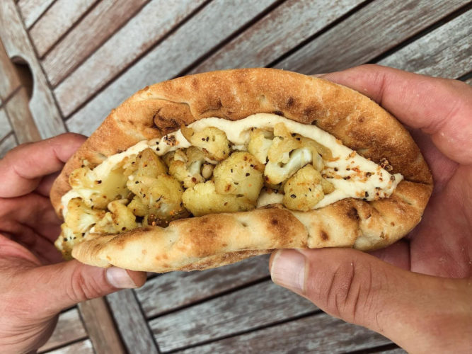 Diners will find vegan kufta (meatballs made with Impossible crumbles instead of traditional lamb), served over yogurt sauce, and hummus with Creole seasoning, slathered on a pita and stuffed with caramelized onion and cauliflower.