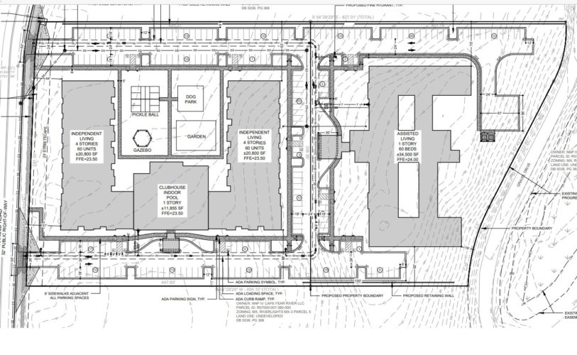 Owned by NNP IV-Cape Fear River, LLC, the currently undeveloped 23.36 acres is already zoned mixed-use; however, only 7.3 acres will be developed. Plans show 178,256 square feet of independent living facilities with 120 units, as well as a 32,944 square-foot one-story assisted-living structure with 60 beds.
