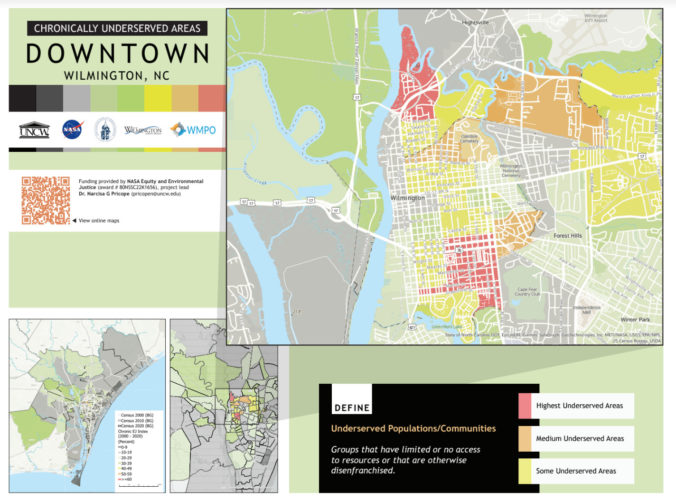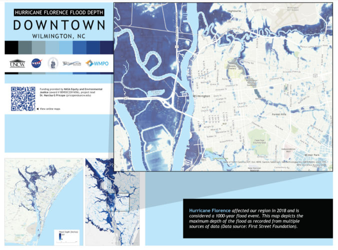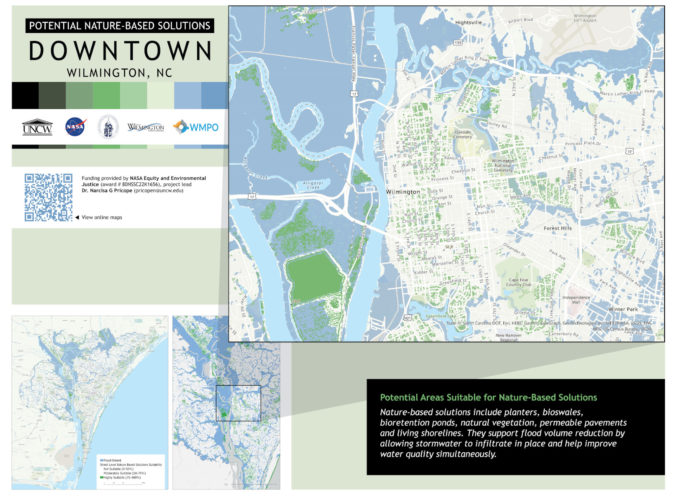 The project, titled “Green infrastructure solutions to support flood mitigation and adaptation in coastal low-lying disadvantaged communities,” compiles NASA satellite data and local geographic mapping to chart local flood projections. It also identifies which Cape Fear communities will face the heaviest impact.