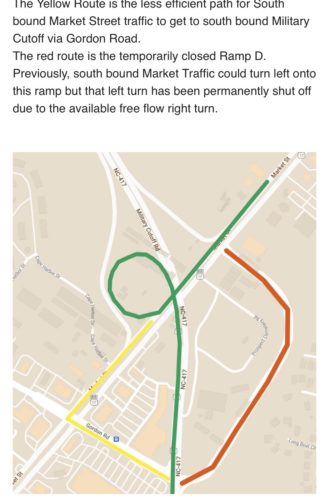 Currently, motorists traveling south on Market Street have to bear right to take the new exit located at NC-417, a few hundred feet before Gordon Road; it loops around to travel south on Military Cutoff. Yet, some drivers continue to turn left on Gordon, which NCDOT said is “less efficient.” More so, it clogs the left turn lane which backs up Market Street traffic.