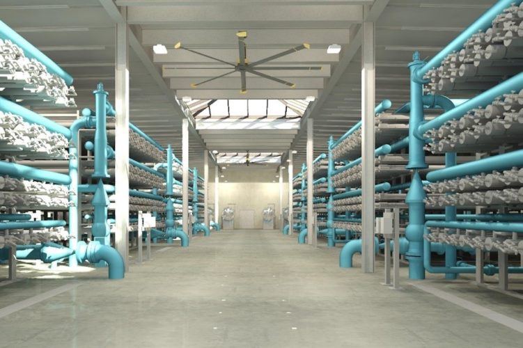 Remaining work includes a disinfection building, sludge pumping facilities, and reverse osmosis skids, which transfers untreated water through a filter chamber and heat exchanger.