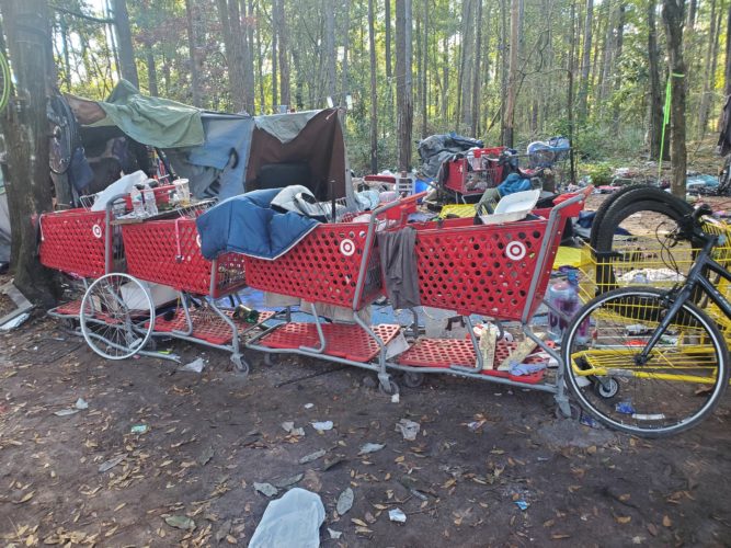 Last month, state and local law enforcement posted no trespassing signs and cleared the MLK/Kerr Avenue camp, with people leaving behind personal belongings not easily transferable. Shopping carts, tents, tarps, TVs, generators and furniture were clumped in piles throughout the nearly 2-acre wooded tract.