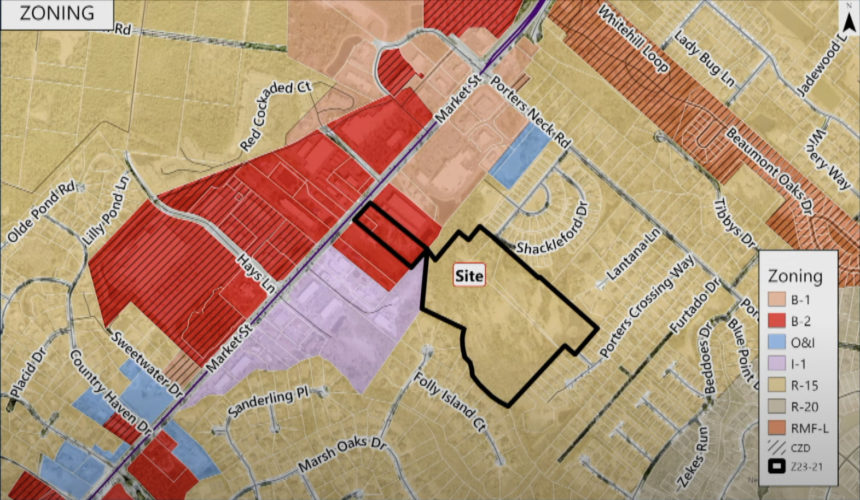 Beyond Porter’s Pointe, the site’s rear and sides are bordered by Porters Crossing and Marsh Oaks residential communities.